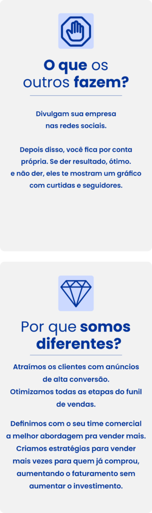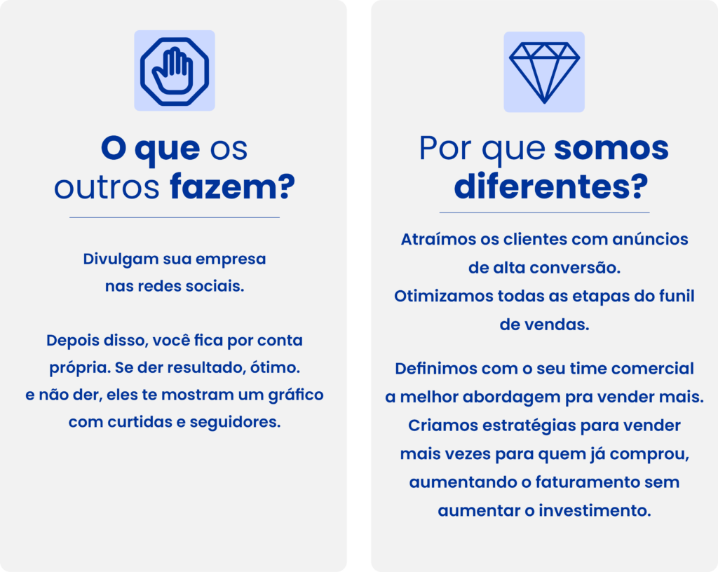 Nas agências digitais, a preocupação é sempre preencher checklists de entregas, gerar números de visualizações e curtidas para o seu negócio. O problema é: nada disso paga as contas. Por isso, nosso trabalho é completamente focado nos resultados financeiros. Nós planejamos e executamos uma sequência de ações para aumentar suas vendas com previsibilidade e escala. Nossa entrega é a demanda batendo na sua porta. Participamos ativamente de todo o processo comercial, desde a captação da atenção do possível cliente usando anúncios digitais até o momento do fechamento e a retenção da base adquirida. Auxiliamos seu time comercial a converter mais com estratégias avançadas de vendas.